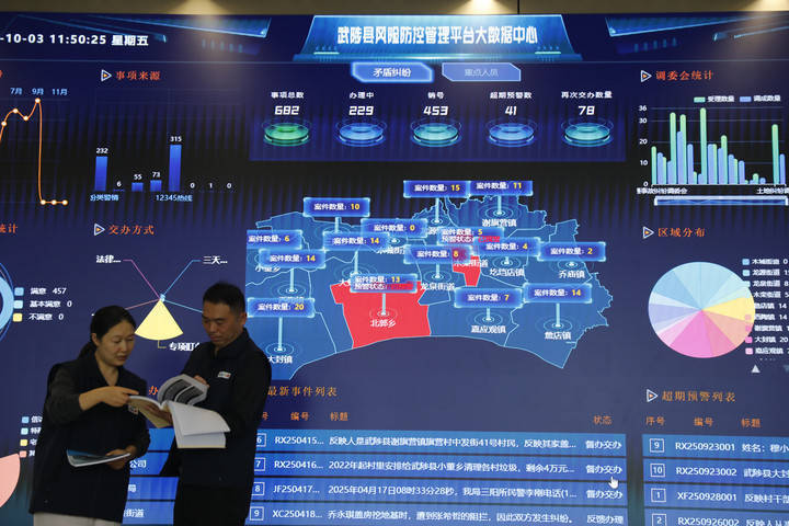 10月3日,在河南省武陟县党建引颈下层高效力治理中心,职责主说念主员通过大数据管控平台,对日常排查发现的矛盾纠纷、季节性重要风险隐患。(冯小敏 摄)针对这种情况,焦作市从头养息优化网格布局,探索提议“多网合一、作念实提效”的网格治理模式。以泛爱县和武陟县为例,本年3月泛爱县将各部门的14474个网格以政法口的综治网格为基础进行套合养息,最终划出985个网格;武陟县将5716个网格划设成2498个。而焦作全市通过养息优化最终成就网格11993个。