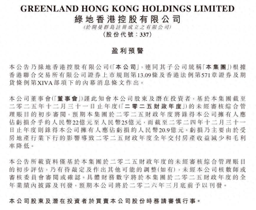 3月24日,绿地香港(00337)发布公告,瞻望公司在收尾2025年12月31日的财年将录得本公司领有东说念主应占圆寂约22亿元至25亿元,而上年同时收尾2024年12月31日的财年则录得应占圆寂约20.9亿元,同比增亏。