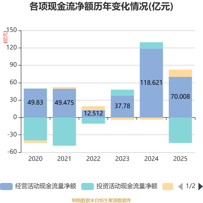 限度2025年,公司策划作为现款流净额为70.01亿元,同比下落40.98%;筹资作为现款流净额12.44亿元,同比增多16.26亿元;投资作为现款流净额-44.02亿元,上年同时为11.05亿元。