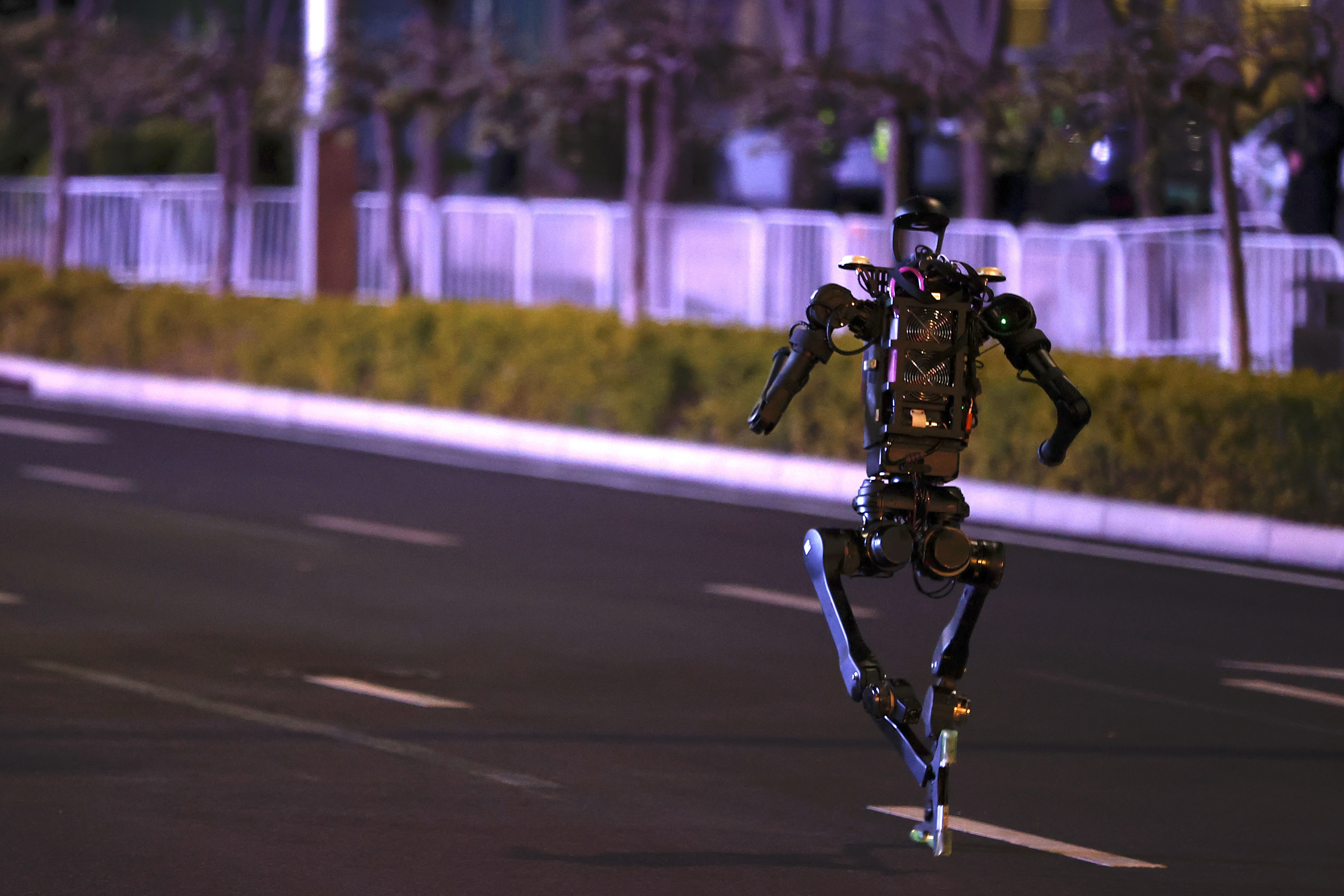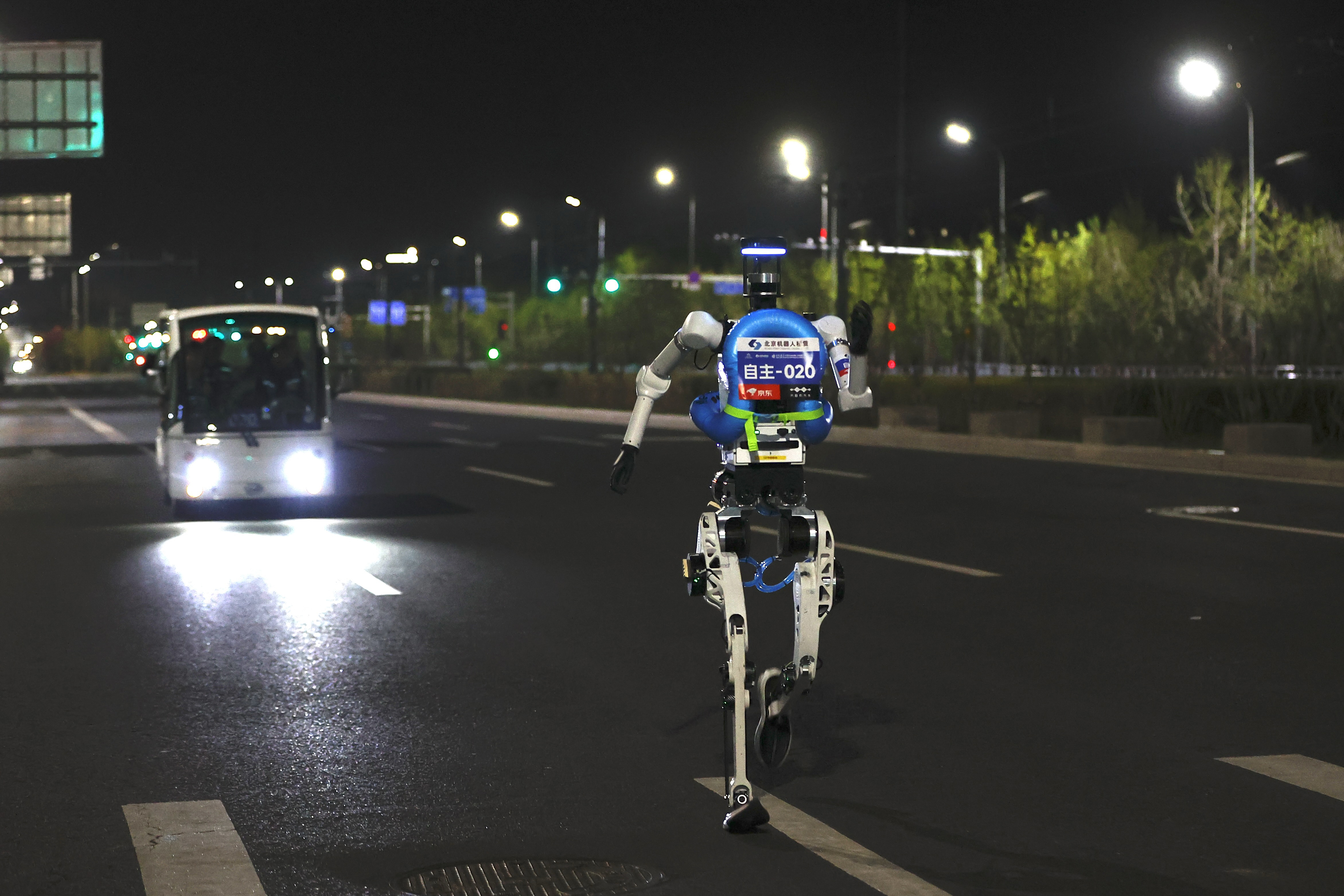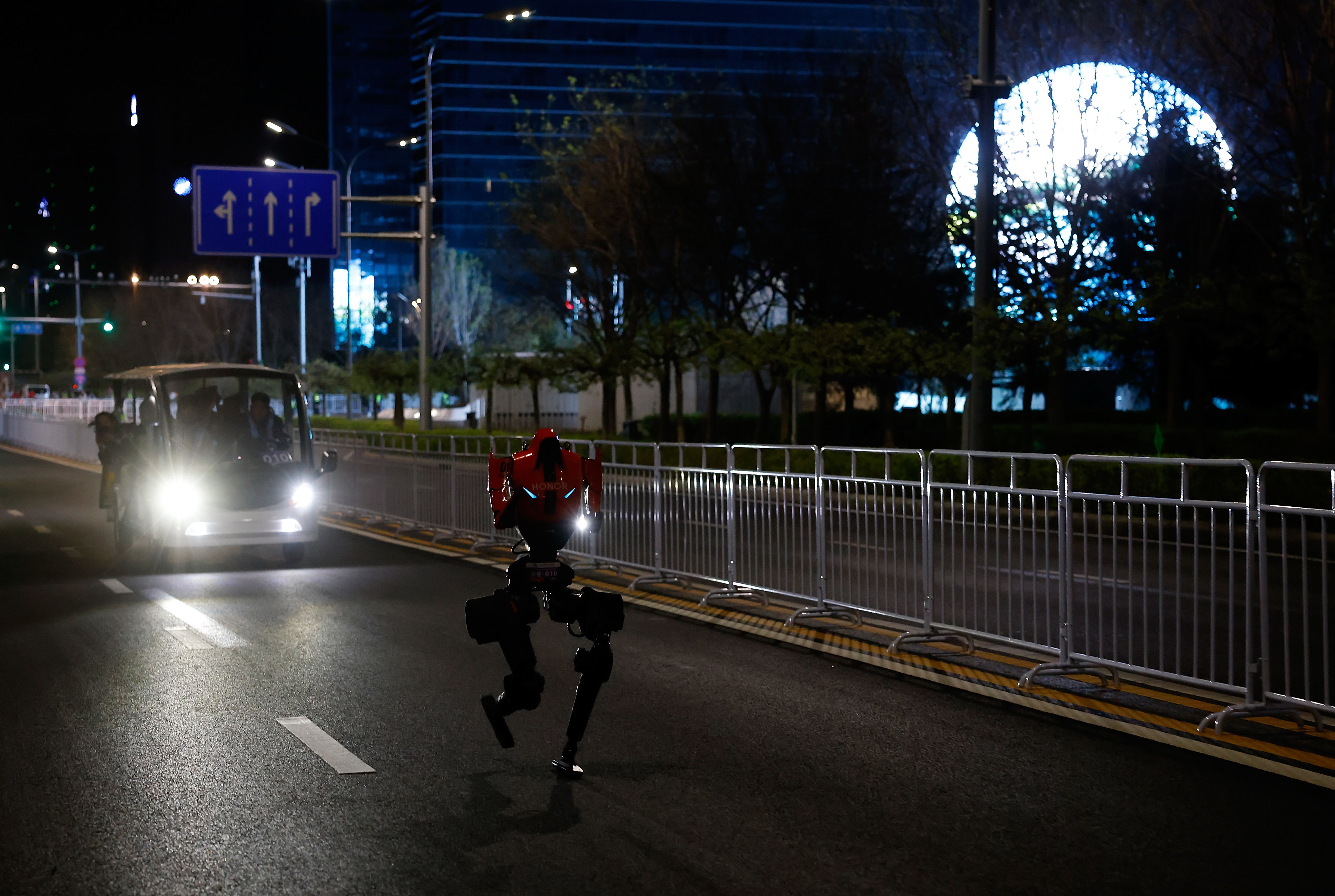4月11日,一台机器东谈主在测试举止中奔走。新华社发(翟一凡摄)