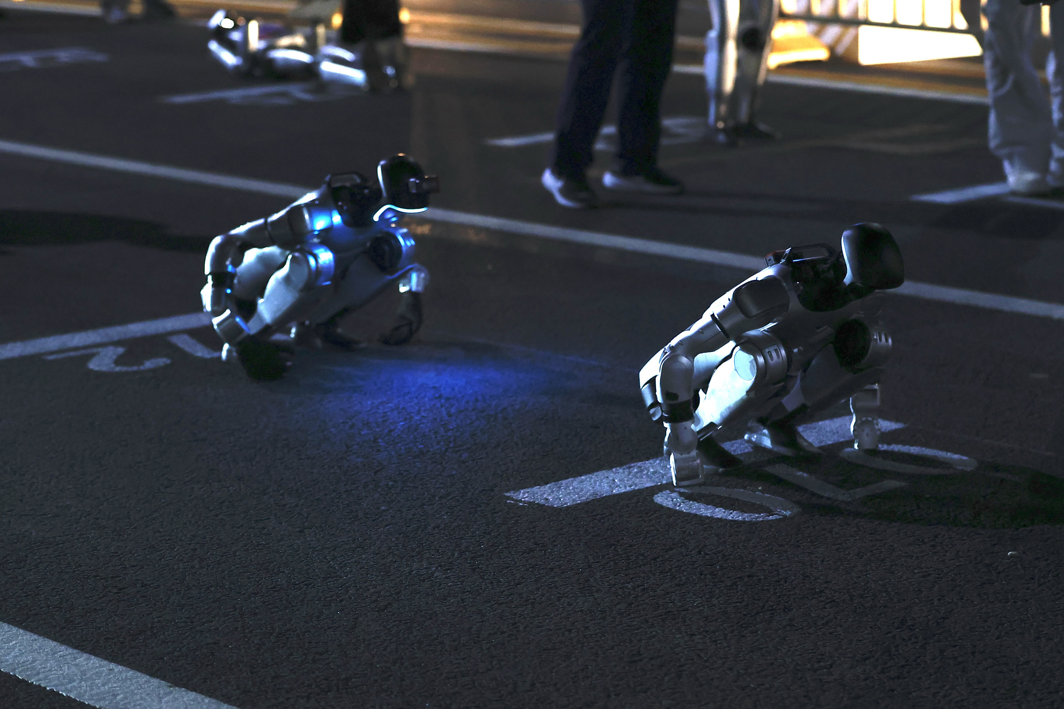 4月11日,两台机器东谈主在测试举止中准备起跑。新华社发(翟一凡摄)