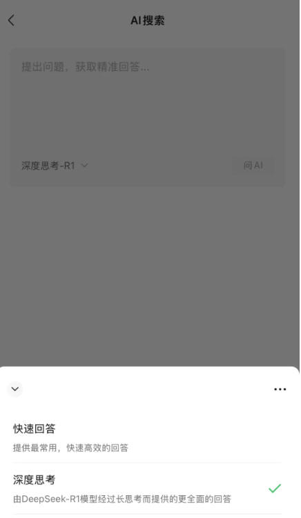 据先容,该进口在微信首页上方的搜索框,用户点开会出现一个“AI搜索”功能。由于处于灰度测试情景,只消部分被选中的用户不错看到。在AI搜索栏输入内容后,用户可聘任“深度念念考”,即DeepSeek- R1模子,在“快速回答”功能外,得回过程长念念考而提供的更全面回答。